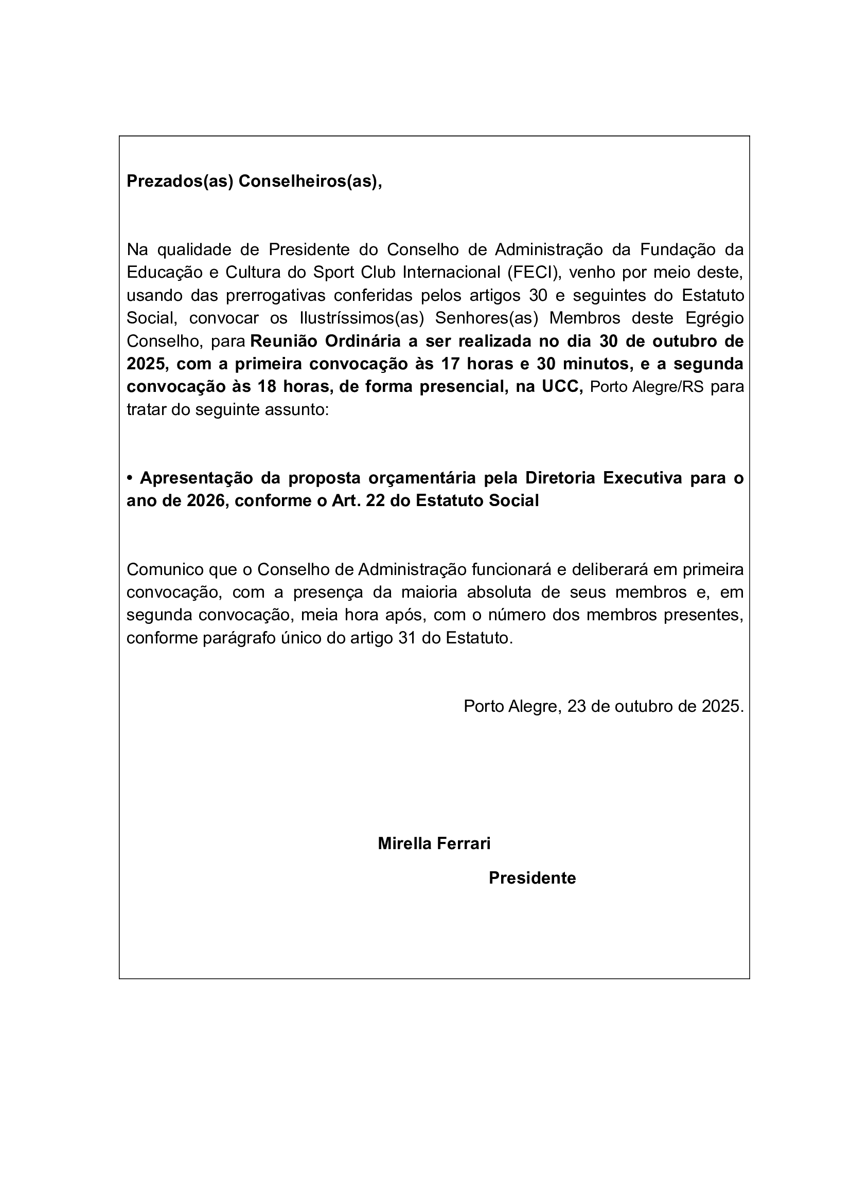 Convocação para Reunião Ordinária do dia 30 de Outubro