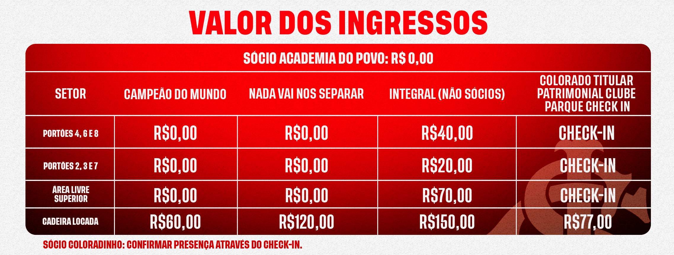 - Sócios e sócias CAMPEÃO DO MUNDO, NADA VAI NOS SEPARAR, ACADEMIA DO POVO E PARQUE INGRESSO: acesso liberado ao Beira-Rio mediante compra de ingresso gratuito no Mundo Colorado e entrada para acompanhante por 20 reais.