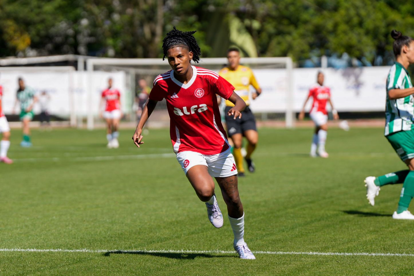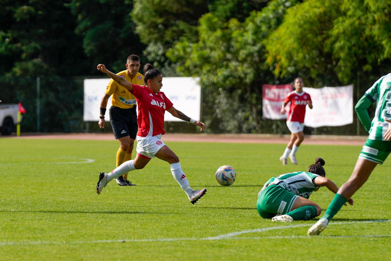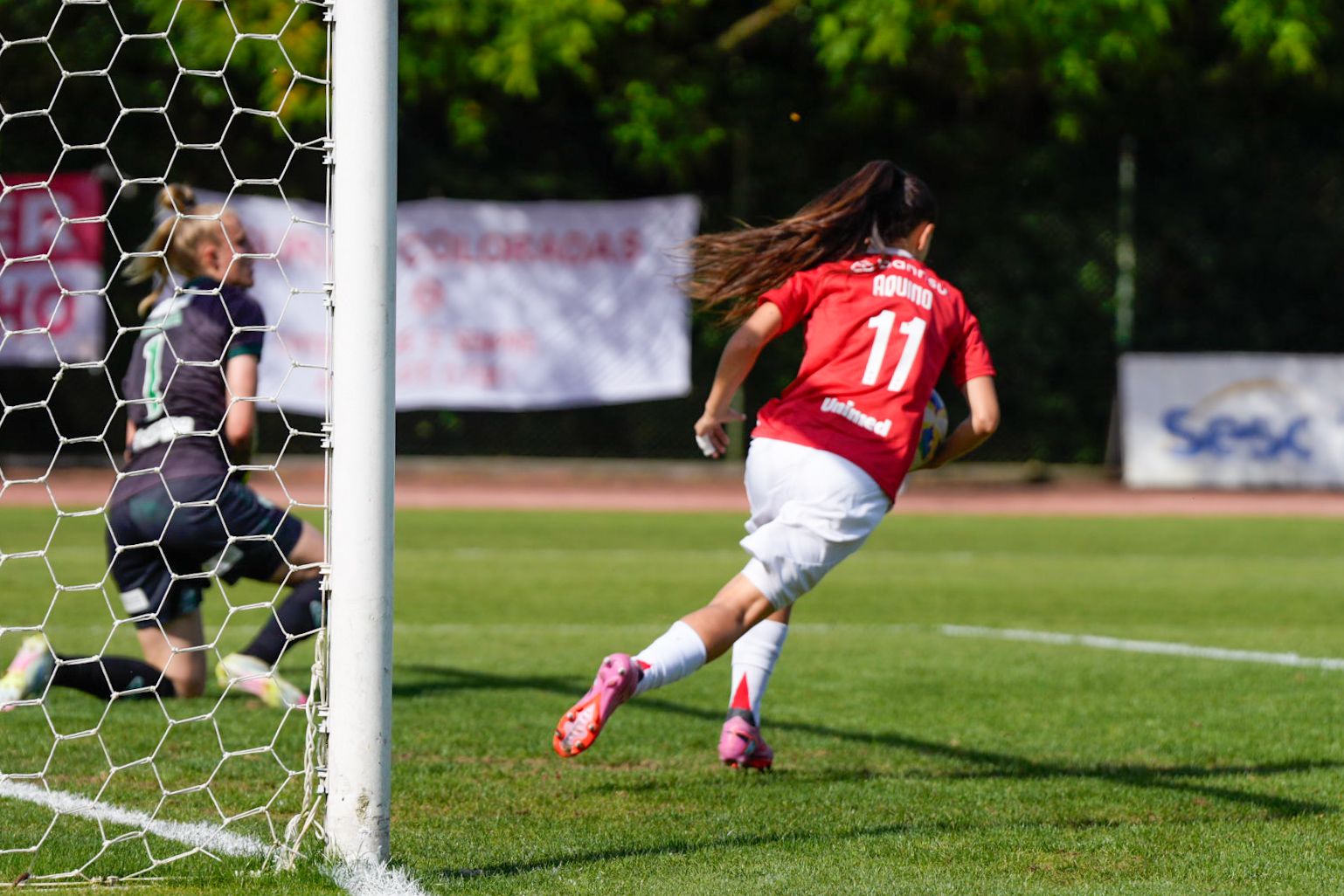 Ainda no primeiro tempo, o Inter criou as melhores oportunidades. Após uma jogada individual, Belén Aquino invadiu a área, driblou a defensora e foi derrubada: a arbitragem marcou pênalti. A própria camisa 11 bateu e converteu.