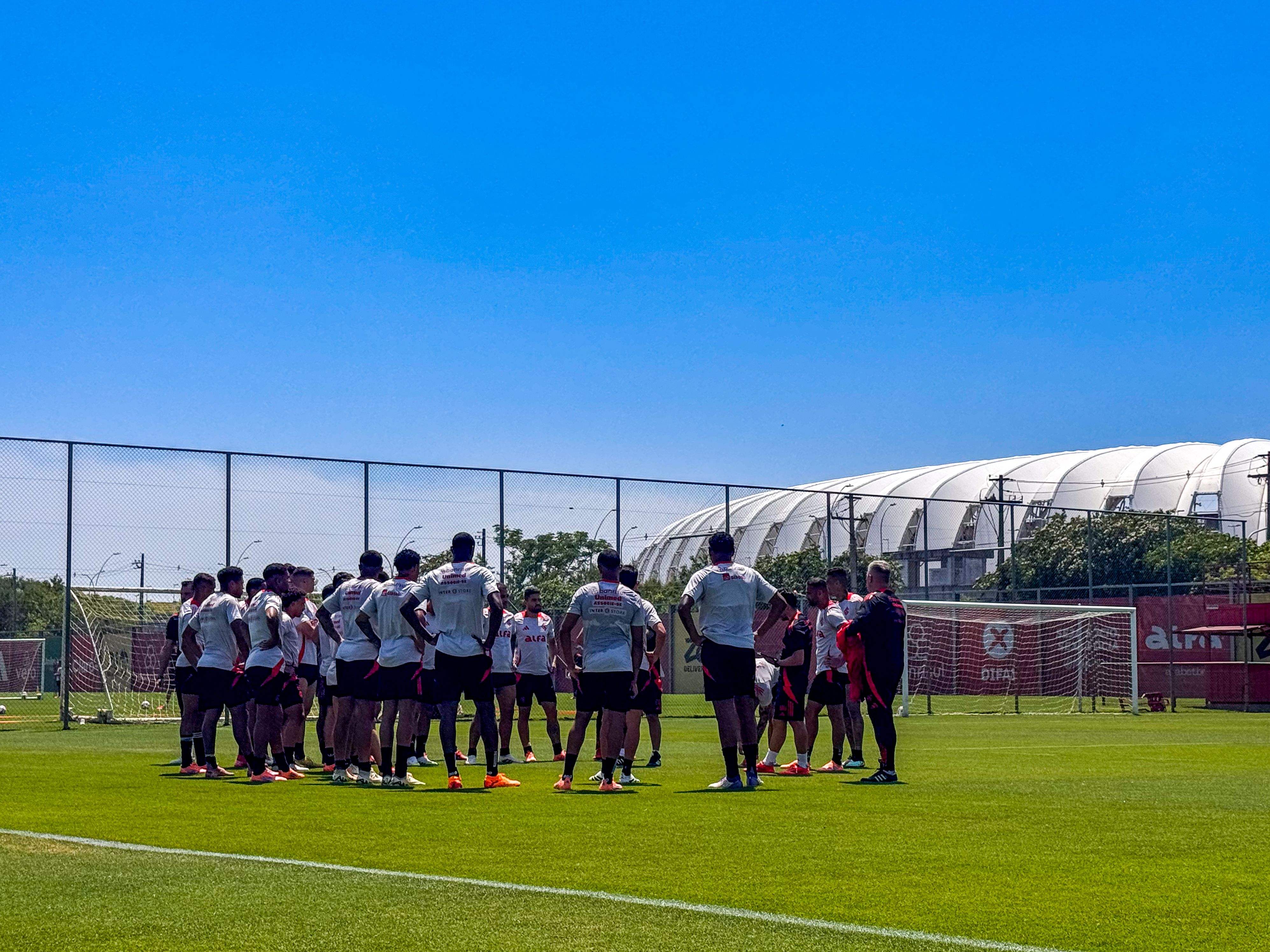 Os jogadores iniciaram a manhã com exercícios físicos na academia. Depois, no gramado, a equipe fez atividades técnicas com bola, seguido por um trabalho tático de movimentação e posicionamento.